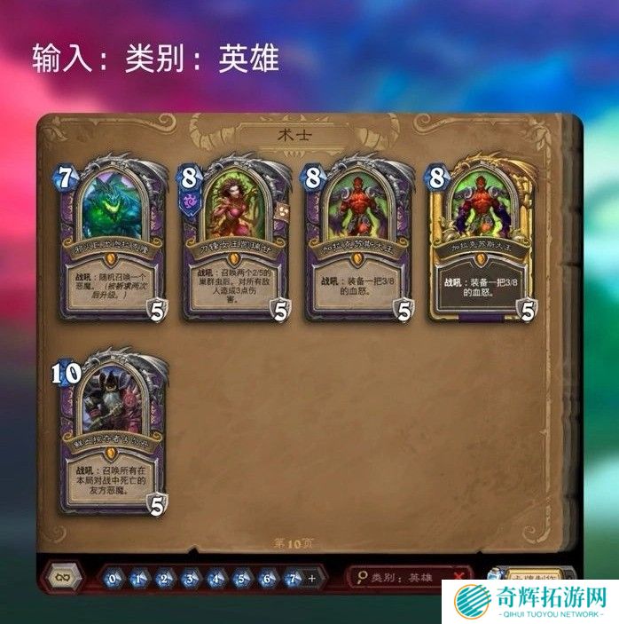 1、类别:英雄 ➜ 查找英雄牌,例如死亡骑士的“巫妖王”或战士的“迦拉克隆”。