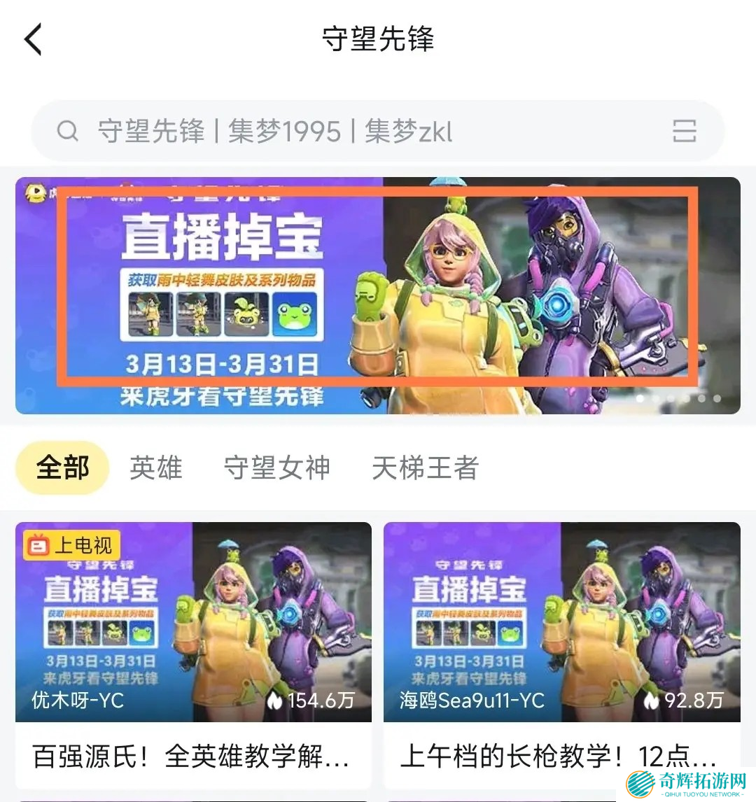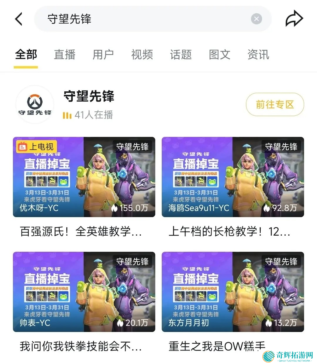>打开虎牙App,搜索“守望先锋”,进入专区。