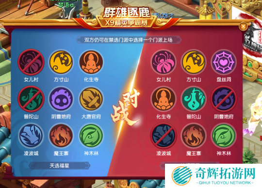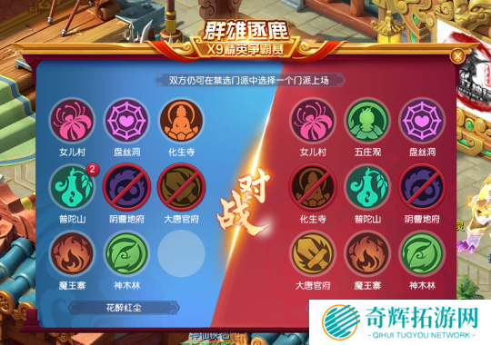 在天启组禁选环节中, 花醉红尘被禁地府、大唐,梦幻理财被禁地府、化生。这个禁选就意味着,双方都想破坏对手的点杀阵容体系,任何一方上该类阵容,都会牺牲不少优势。不过,由于梦幻理财的参赛门派较为完善,即便不用化生也能轻松应对花醉红尘的进攻。