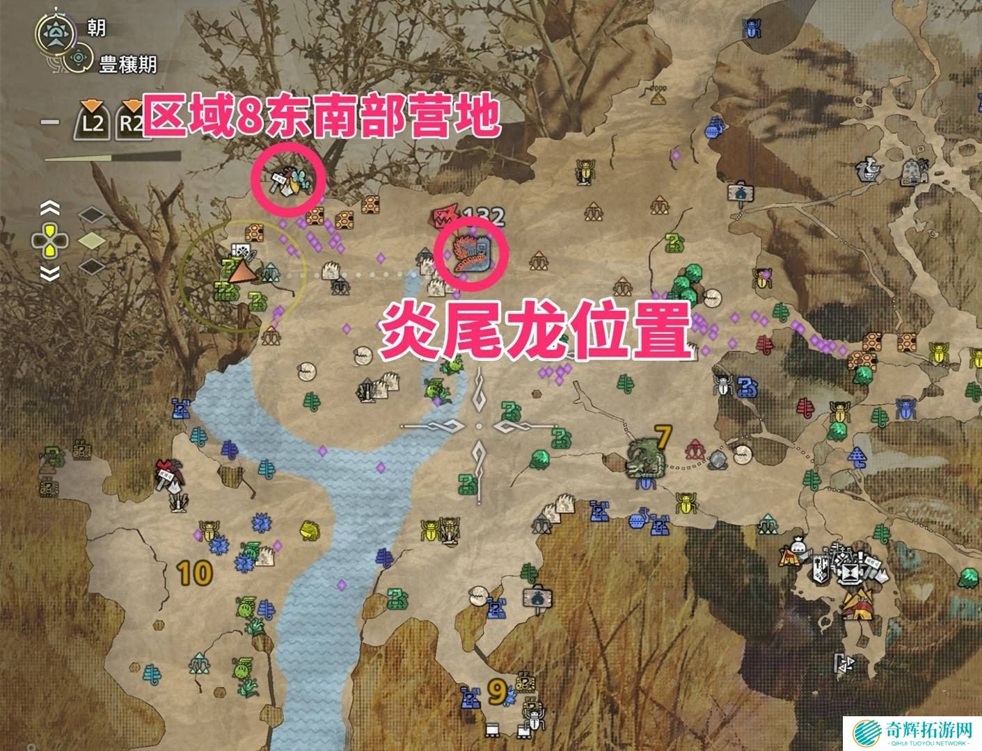 炎尾龙大多刷新在区域8,建议从区域8东南部营地直接出发,这样可以最快速碰到目标怪物,节省跑路时间。