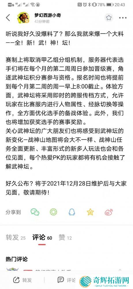2021年最后一个月,梦幻西游电脑版执行主策划小奇对外爆料称,游戏巅峰赛事武神坛将迎来重大改动,不仅赛制上将取消甲乙组分组机制,还将采用即时的跨服传档方式,允许玩家在比赛服内进行人物属性、经脉切换等操作,全方面优化选手的备战体验。