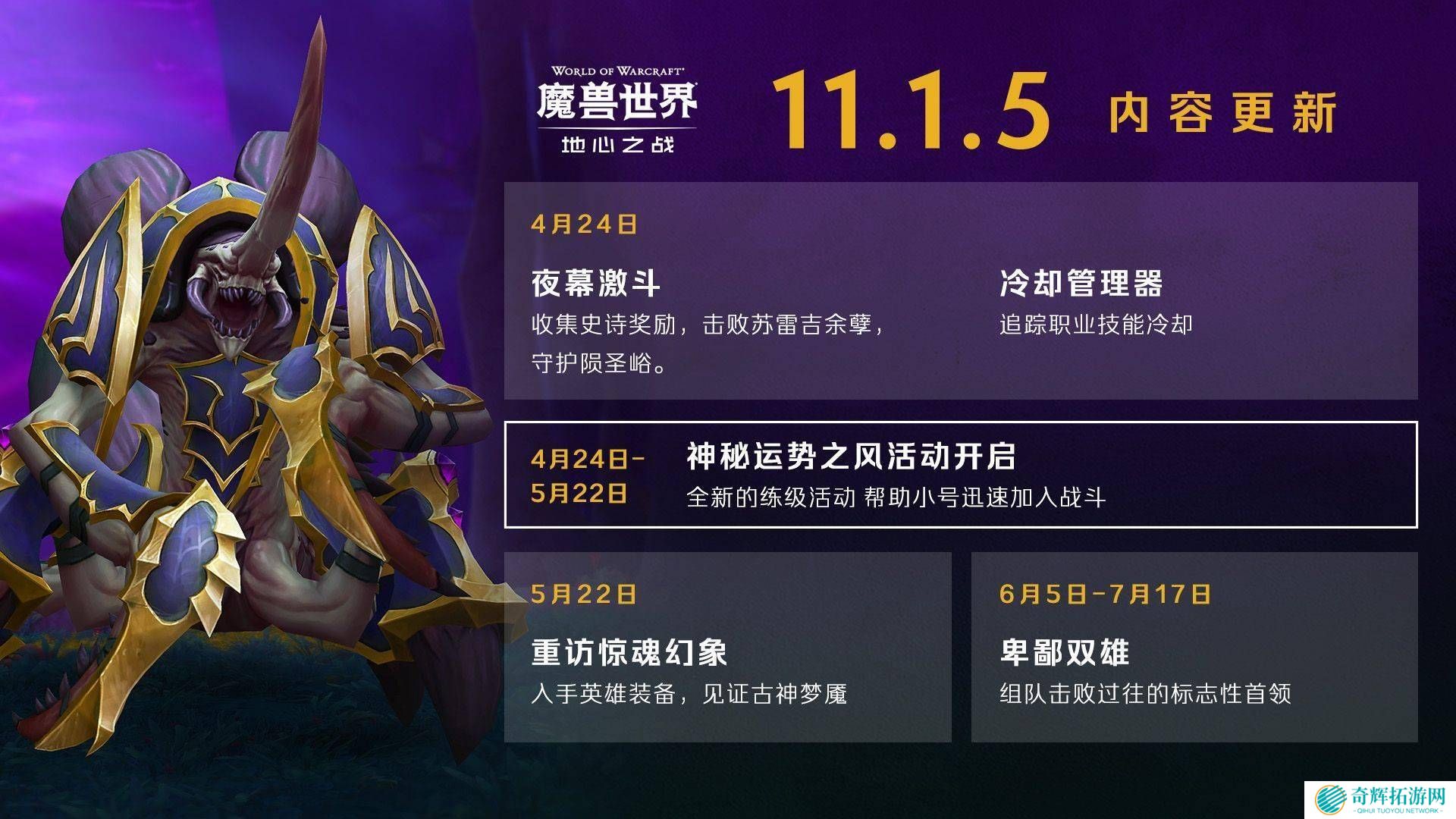 暴雪公司于4月9日正式宣布,其备受期待的11 1 5内容更新将于4月24日正式上线。此次更新带来了一系列精彩的新内容,包括夜幕激斗场景战役、界面革新、冷却管理器功能的引入,以及神秘运势之风活动,为玩家