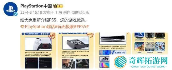 今日,PlayStation中国发布动态,“给大家重新介绍PS5,您的游戏优选”。并配有四张宣传图,讲解语音畅聊、大存储空间和易扩展、主机便宜的价格、实体版游戏不加价这四个方面。GameChat语音畅