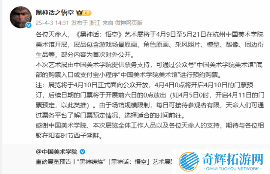 就在今日,游戏科学在微博发文宣布,《黑神话:悟空》艺术展将于4月9日至5月21日在杭州中国美术学院美术馆开展,展品包含游戏场景原画、角色原画、采风照片、模型、雕像、周边衍生品等,部分内容为首次对外公开