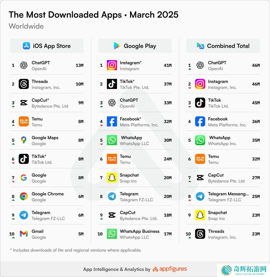 本站 4 月 12 日消息,市场调查机构 App Figures 发布博文,报告 2025 年 3 月全球非游戏应用下载量,ChatGPT 以 4600 万次力压 Instagram 和 TikTok