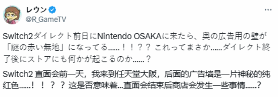 日前,有日本youtube博主发现,在任天堂大阪旗舰店出现了一块纯红色广告墙,猜测似乎是为Switch 2预留的广告位。他本人猜测,在今晚直面会结束会,与Switch 2相关的广告将会被置换上去。展示