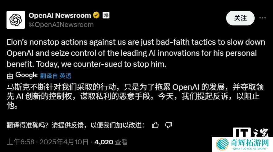 本站 4 月 10 日消息,OpenAI 与亿万富翁、其前联合创始人埃隆・马斯克之间的戏剧性诉讼似乎并没有缓和迹象。这场法律大战的焦点围绕着 OpenAI 的公司结构转型以及其使命的履行。OpenAI