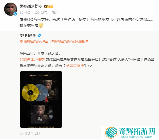 《黑神话:悟空》游戏音乐实体专辑现已正式开启预售,预计最早于4月20日开始陆续发货。预售开启后,《黑神话:悟空》官方发文表示:“感谢QQ音乐支持,喜欢《黑神话:悟空》音乐的朋友也可以考虑来个实体盘,摆