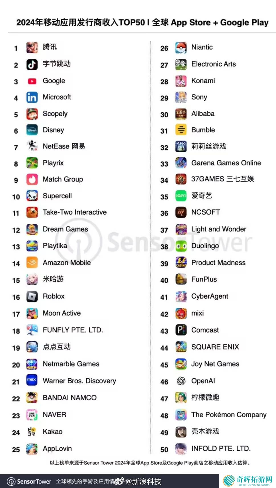 近日,全球移动应用市场的年度盛事再度来袭,Sensor Tower权威发布的《2024年全球移动发行商收入TOP50》榜单震撼公布。据报告显示,2024年,全球消费者在移动应用上的消费总额首次迈过15