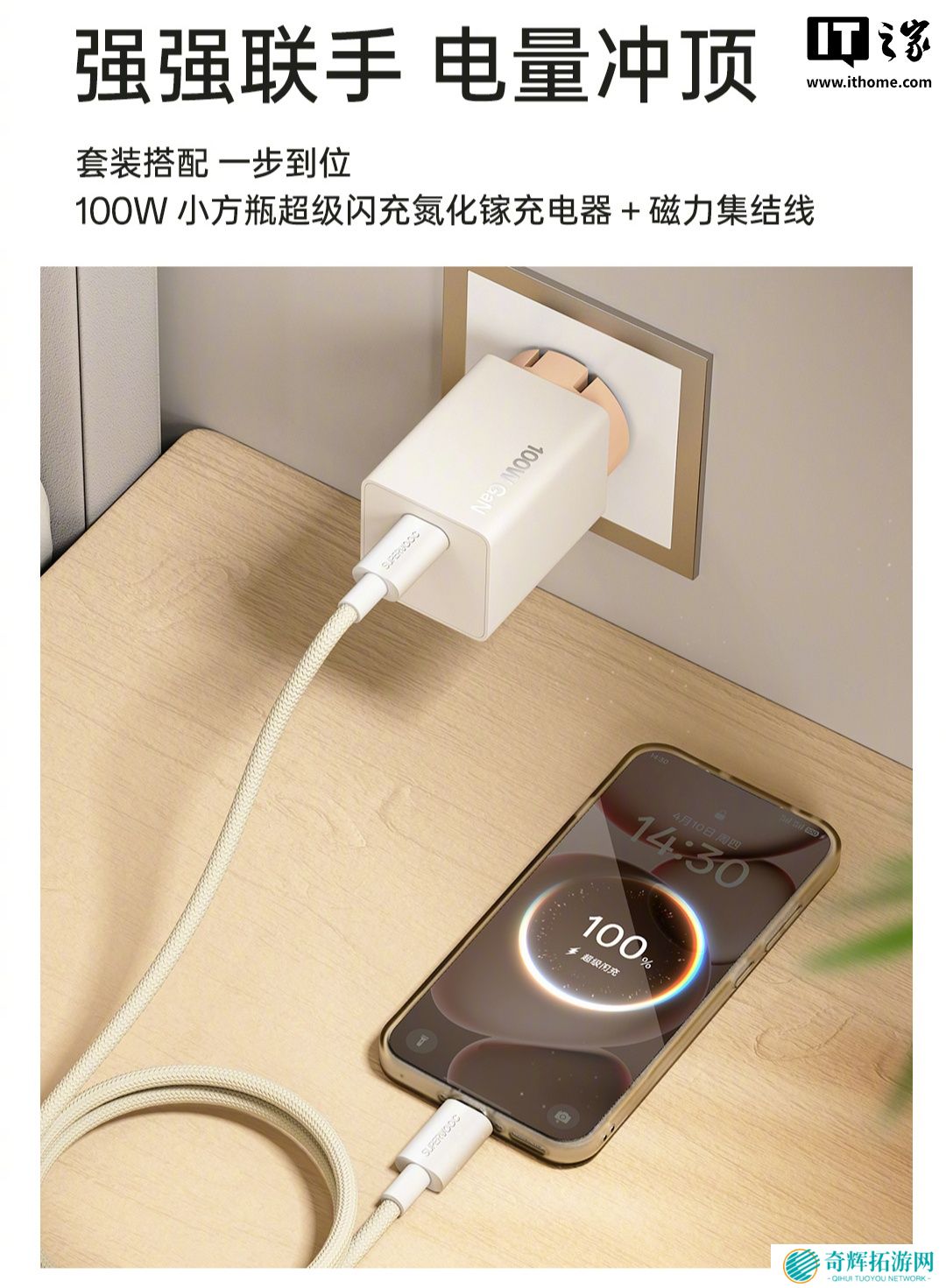 本站 4 月 8 日消息,OPPO 100W 小方瓶超级闪充氮化镓充电器今日开启预热,新品采用“前圆后方”的设计,可配合磁力集结线使用,4 月 10 日发布。据介绍,OPPO 100W 小方瓶超级闪充