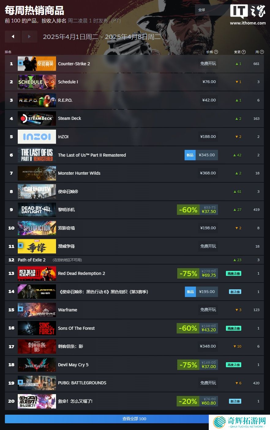 感谢本站网友 雨雪载途 的线索投递! 本站 4 月 8 日消息,Valve 刚刚公布了 Steam 最新一周游戏销量排行榜,第一人称模拟游戏《Schedu