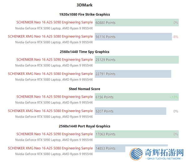 近日,Notebookcheck公布的最新性能测试数据揭示了RTX 50系列移动显卡之间的性能差异。据报告显示,RTX 5080移动版在性能表现上,相较于RTX 5090移动版,落后了大约10%至15