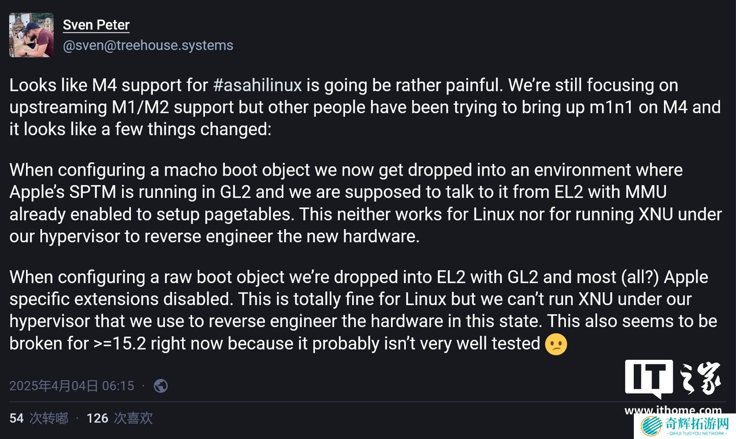 本站 4 月 9 日消息,科技媒体 AppleInsider 昨日(4 月 8 日)发布博文,报道称 Asahi Linux 项目团队表示,由于苹果调整了 Apple Silicon 芯片,提高了将操