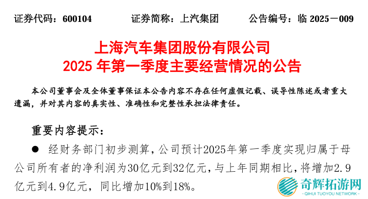 感谢本站网友 西窗旧事 的线索投递! 本站 4 月 8 日消息,上汽集团今日发布公告,公司预计 2025 年第一季度实现归属于母公司所有者的净利润为 30