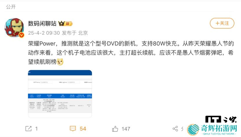 感谢本站网友 冬日限定琪、顺势而为、雨雪载途、Autumn_Dream 的线索投递! 本站 4 月 2 日消息,荣耀 Power 入网信息曝光,引发热议。