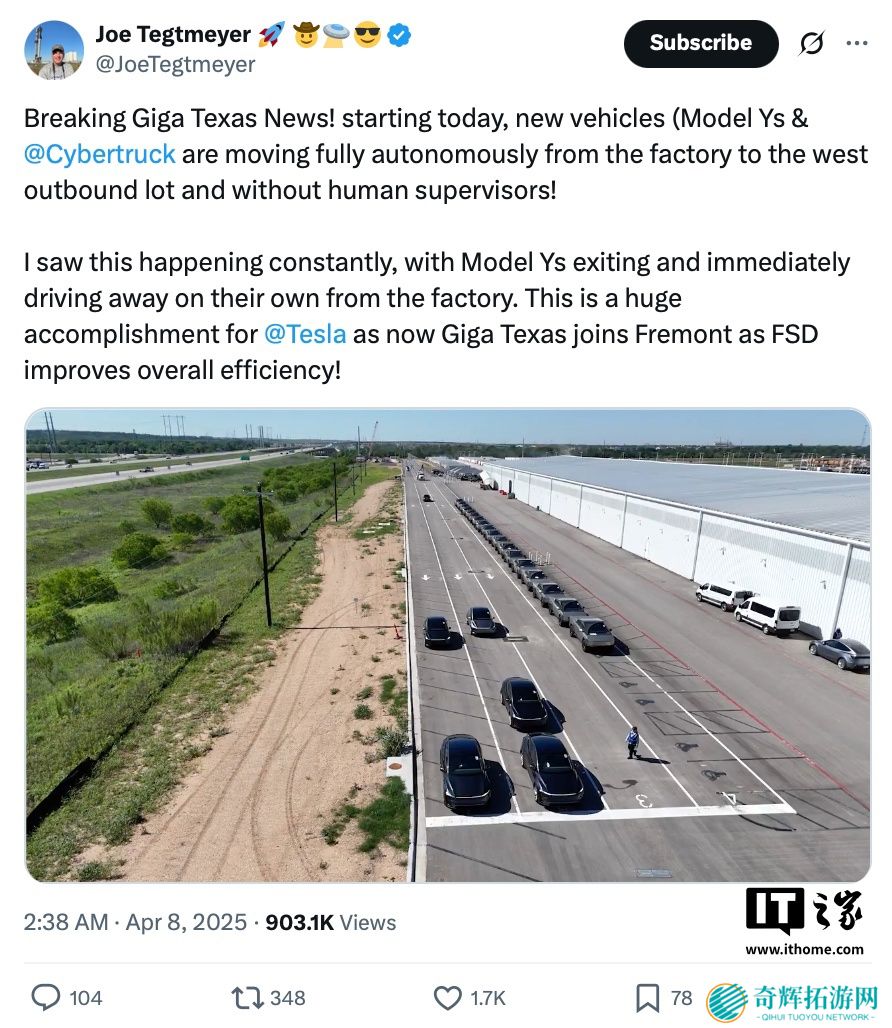 本站 4 月 8 日消息,特斯拉在几个月前宣布其在美国加州工厂出产的车辆已能自动驶向出厂区,而如今,该公司在得州超级工厂也迈出了同样的一步。据消息源 Joe Tegtmeyer 透露,其发现特斯拉已在