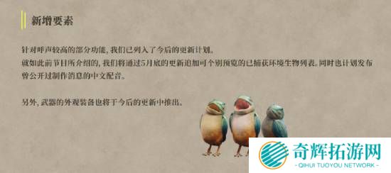卡普空官方微博账号今日发文,称现已于官网公开来自《怪物猎人:荒野》德田总监的致玩家信,为大家介绍了未来更新计划与预定修复与调整的各项内容。另外,官方还公开了有关中文配音的最新消息。卡普空计划通过5月底