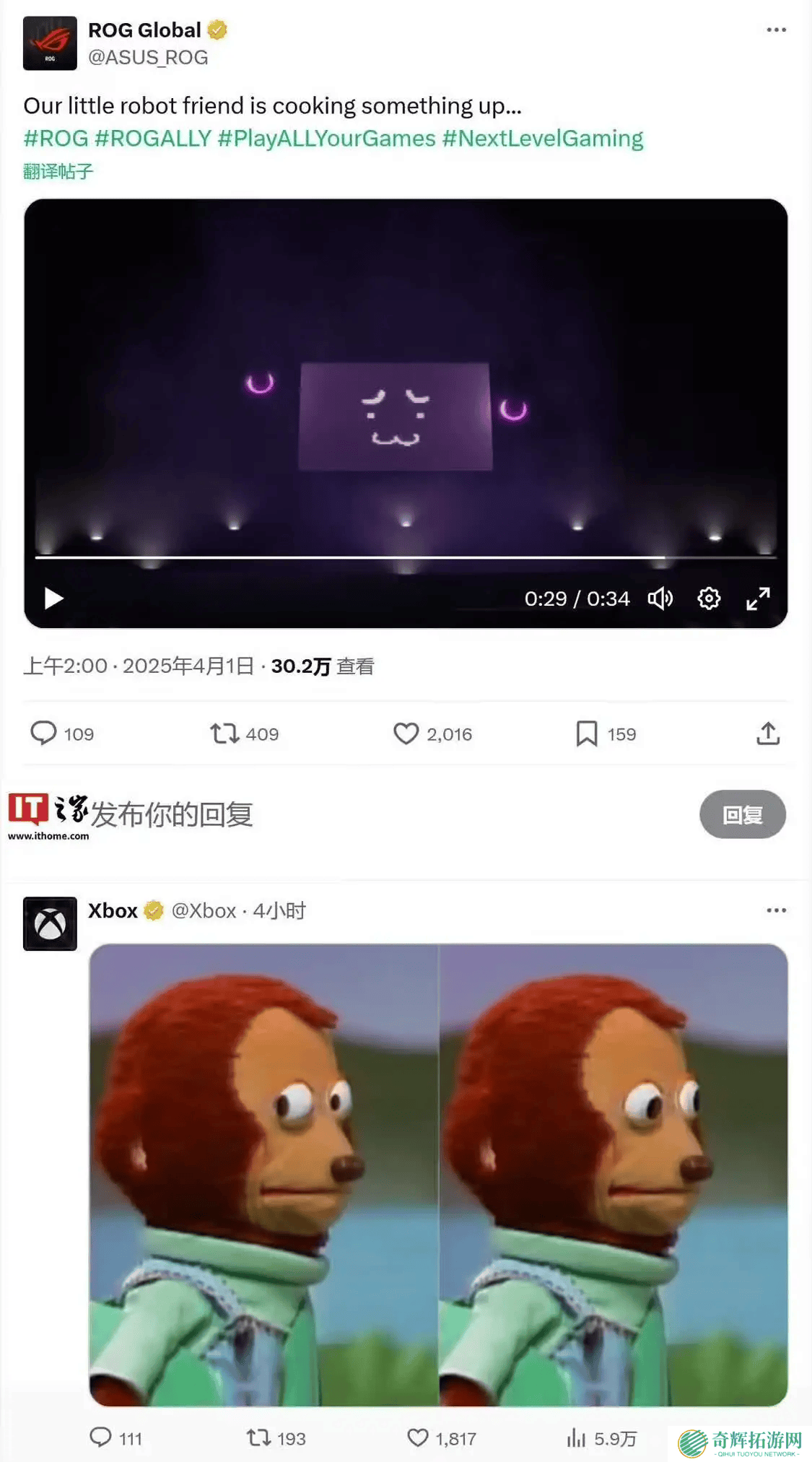 华硕ROG玩家国度与微软Xbox的合作终于浮出水面,近日,ROG官方在社交媒体平台上发布了一段预热视频,揭示了双方联手打造的新款ROG Ally系列掌机。有趣的是,微软Xbox官方账号也在下方留言互动