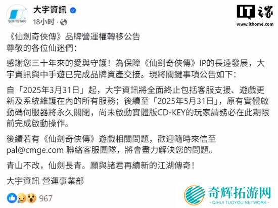 据IT之家消息,大宇资讯昨日发布《仙剑奇侠传》品牌营运权转移公告:尊敬的各位仙迷们:感谢您三十年来的爱与守护!为保障《仙剑奇侠传》IP 的长远发展,大宇资讯与中手游已完成品牌资产交接。现将关键事项公告