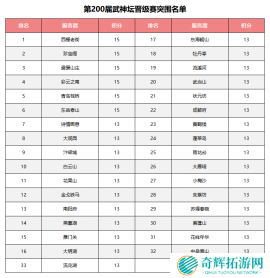 梦幻西游第200联武神坛晋级赛目前已经结束,本次晋级赛共有33个服务器成功突围,其中西栅老街、珍宝阁、避暑山庄、彩云之南、青岛栈桥、东岳泰山