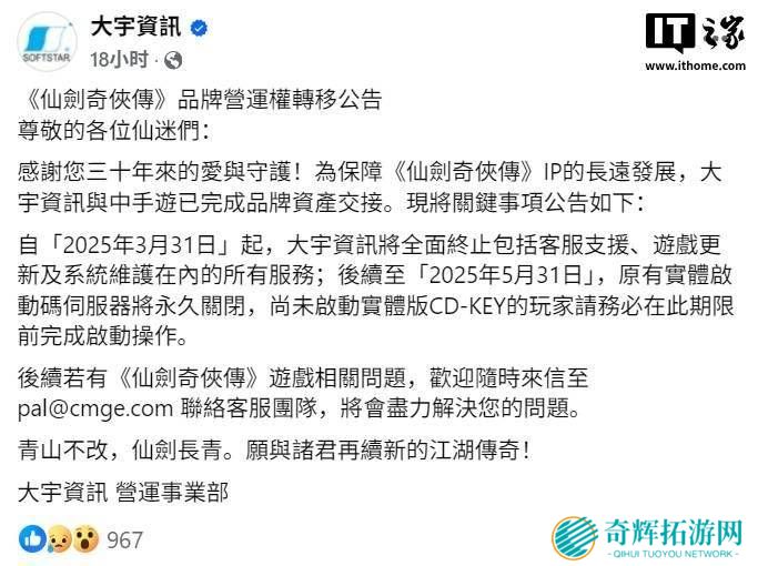 近期,大宇资讯正式对外公布了《仙剑奇侠传》品牌运营权转移的重大消息,这一举动引发了广大仙迷们的广泛关注。在公告中,大宇资讯首先向三十年来始终支持并热爱着《仙剑奇侠传》系列的玩家们表达了深深的感激之情。