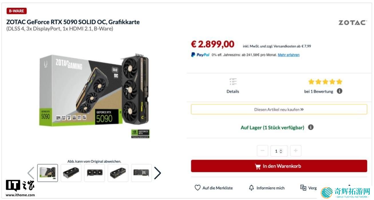 近日,德国知名零售商Alternate的货架上出现了一款标注为“B类商品”的索泰RTX 5090 SOLID OC显卡,标价高达2899欧元,折合人民币约22762元。这一价格引起了广泛关注。 据该零