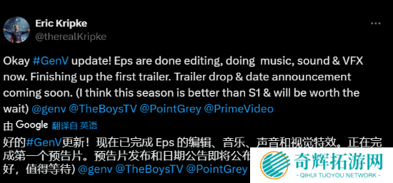 《黑袍纠察队》衍生剧《V世代》的编剧Eric Kripke近日在社交平台X上发文表示,《V世代》第二季剧集的剪辑已完成,正在进行配乐、音效和视效部分的制作,播出日期即将公布,第一个预告片正在制作当中。