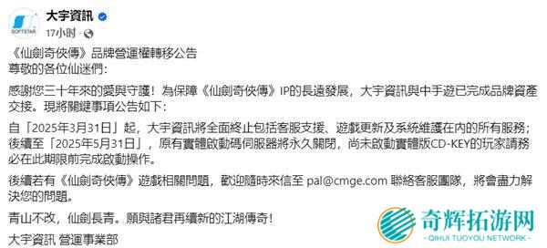 近日,大宇资讯正式对外宣布,其经典游戏品牌《仙剑奇侠传》的运营权即将发生变动。这一消息引起了广大玩家的关注和讨论。根据大宇资讯发布的官方公告,从2025年3月31日起,公司将全面停止针对《仙剑奇侠传》