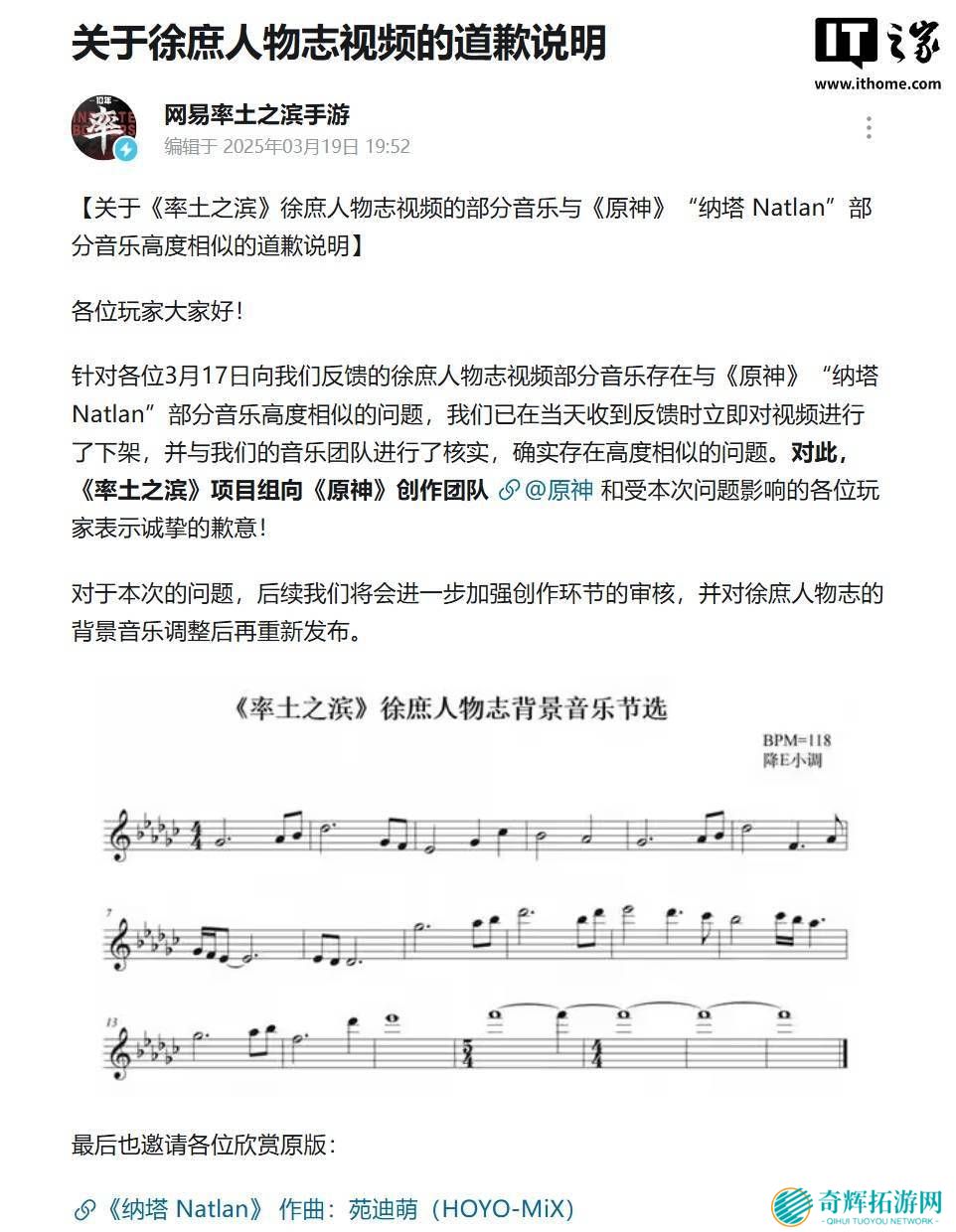 近日,网易旗下热门手游《率土之滨》发布了一则道歉声明,该声明涉及游戏中徐庶人物志视频的背景音乐问题。据玩家反馈,该段音乐与热门游戏《原神》中“纳塔 Natlan”地区的背景音乐存在高度相似性。《率土之