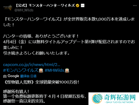 3月31日,卡普空官方宣布《怪物猎人:荒野》的首月销量突破千万!感兴趣的玩家可以点击下方卡片购买!本作的游戏总监德田优在官网发布长文寄语以表感谢,在文章中他还介绍了一些未来计划。除了从4月4日起将陆续