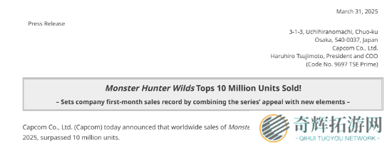 卡普空今日宣布,系列新作《怪物猎人:荒野》自2月28日发售以来,全球销量已突破1000万份,引起玩家热烈讨论。消息公布后,不少玩家纷纷祝贺,直呼“怪猎不愧是顶级IP,一个月破千万太疯狂!”还有人戏称,