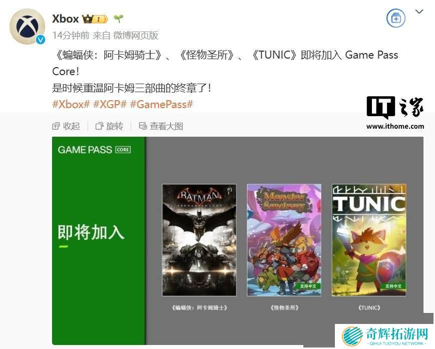 微软Xbox官方近日在微博上公布了一系列令人振奋的游戏加入计划,为玩家们带来了更多精彩选择。其中,《蝙蝠侠:阿卡姆骑士》、《怪物圣所》以及《TUNIC》这三款备受期待的游戏,即将登陆Game Pass