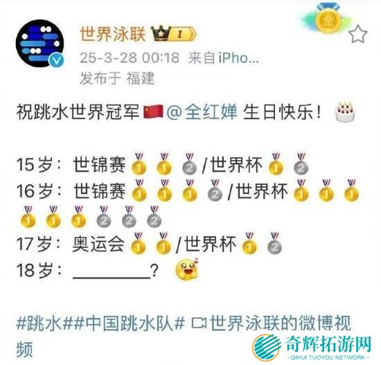 3月28日,全红婵迎来了18岁生日。凌晨0点18分,@世界泳联 发文祝全红婵生日快乐!近日全红婵在活动中提前庆祝生日,希望自己以后越来越好。陈芋汐、昌雅妮、王宗源也纷纷送上生日祝福。之前,全红婵曾说1