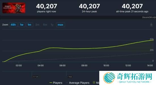《刺客信条:影》已于今日发售 截至发稿前,Steam平台有40207名玩家同时游玩本作,突破4万人,且最高纪录仍不断刷新中!作为对比,两部前作《刺客信条:幻景》和《刺客信条:英灵殿》的Steam在线峰