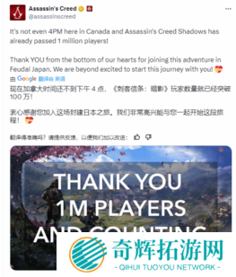 育碧官方宣布,《刺客信条:影》玩家数量已突破100万。《刺客信条》官方发文称:“这里是加拿大,现在还不到下午4点,《刺客信条:影》的玩家已经突破100万!” 官方团队向广大玩家表示感谢,并称这一里程碑