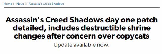 据eurogamer报道,育碧近日悄然推送了《刺客信条:影》的首日更新补丁,其中一项关键改动是对游戏中神社场景的互动性进行了调整,使得部分物品不再可破坏。媒体指出,尽管改动幅度不大,但这一调整显然是对