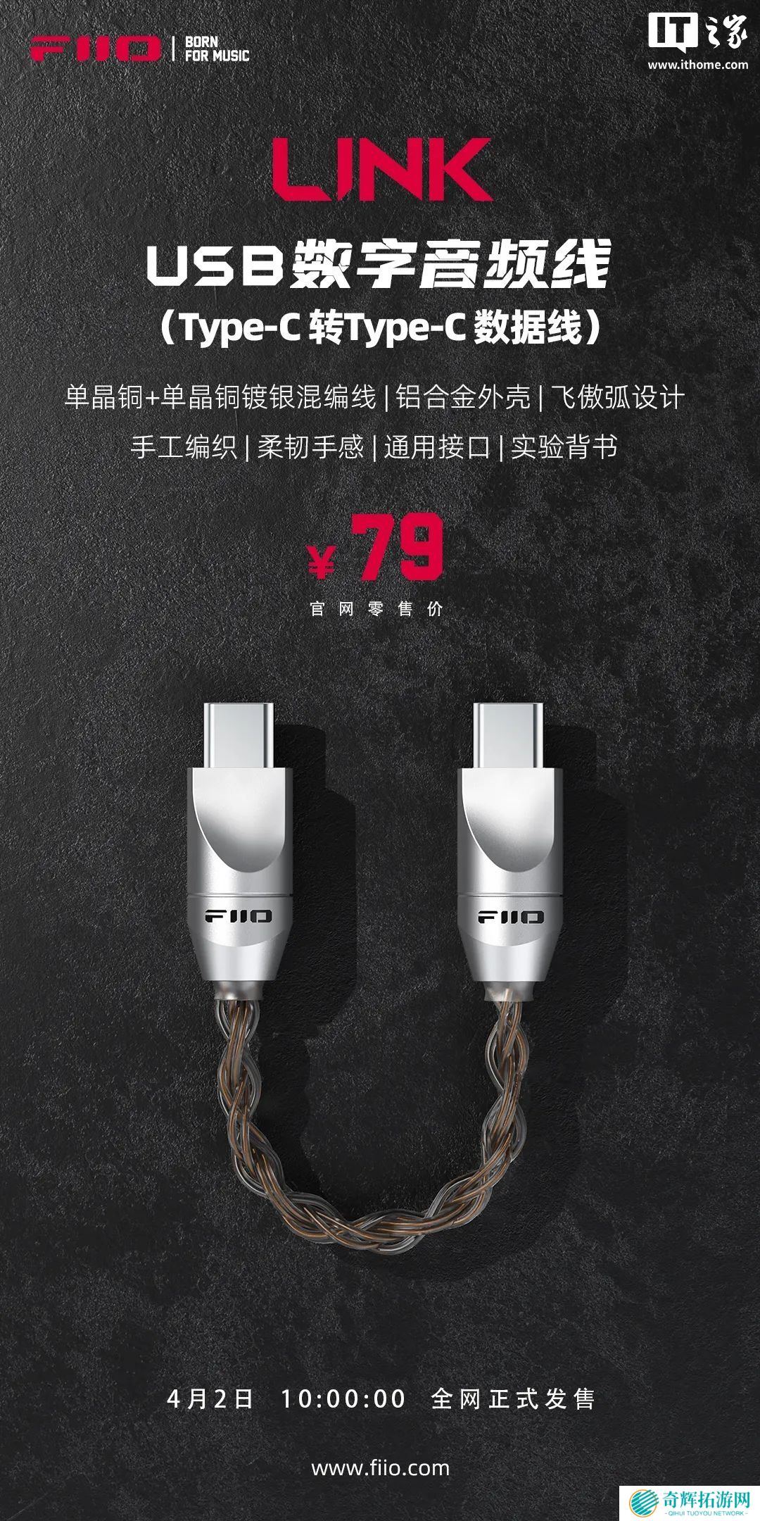 本站 4 月 3 日消息,飞傲推出一款 USB(Type-C 转 Type-C)数字音频线 LINK,新品现已在京东、天猫等线上线下购买渠道开售,官方售价为 79 元人民币。这款数字音频线的插头外壳为