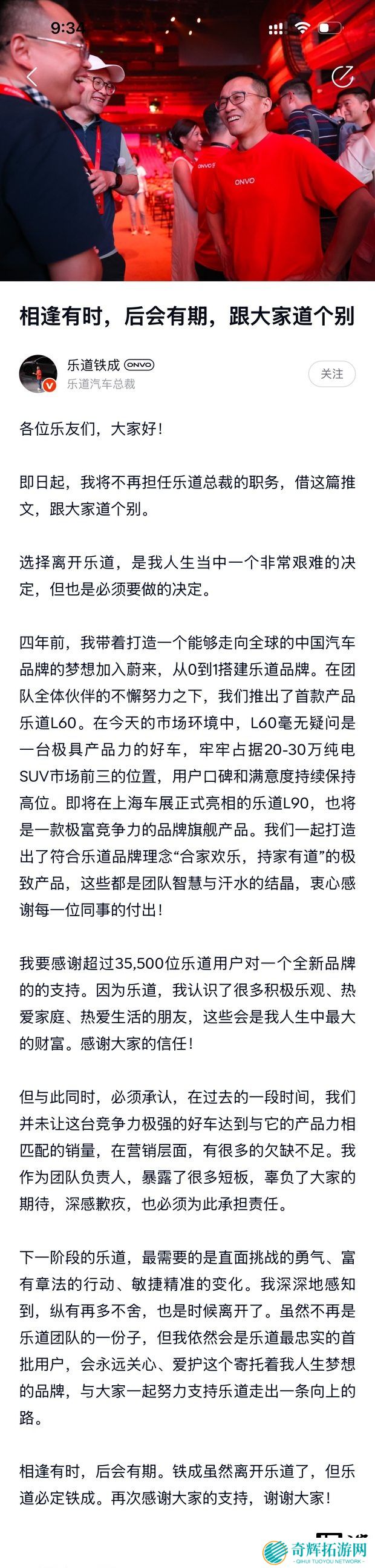 感谢本站网友 Skyraver、海珠孤岛 的线索投递! 本站 4 月 2 日消息,乐道汽车总裁艾铁成今日通过乐道 App 发表文章宣布离职,不再担任乐道汽