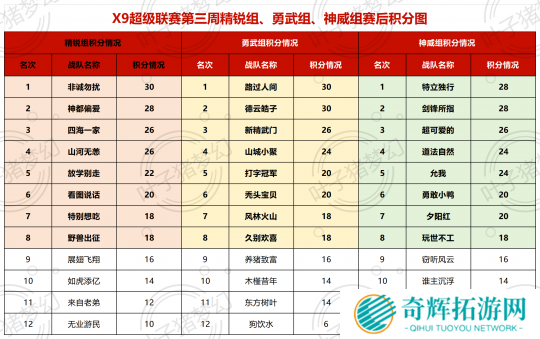 梦幻西游X9超级联赛在经历三周的比赛后,精锐、勇武、神威的积分情况已经基本确定。其中精锐组【非诚勿扰】、勇武组【路过人间】和【德云皓子】在三