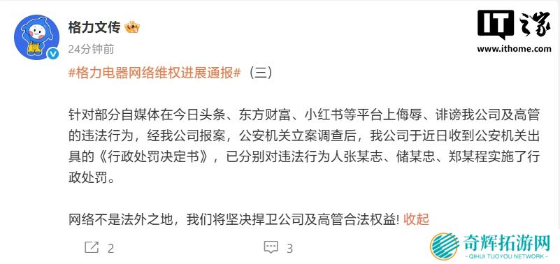 本站 4 月 2 日消息,珠海格力电器股份有限公司文化传媒中心官微“格力文传”今日通报格力电器网络维权进展:针对部分自媒体在今日头条、东方财富、小红书等平台上侮辱、诽谤我公司及高管的违法行为,经我公司