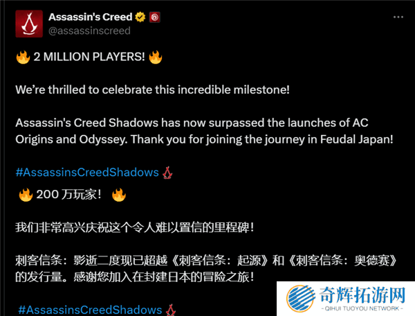 近日,育碧公司宣布其最新力作《刺客信条:影》自3月20日正式发售以来,玩家群体规模迅速膨胀,已成功突破200万大关。这一数字不仅实现了首发日100万玩家数量的翻倍,更是在玩家参与度上超越了系列前作《刺