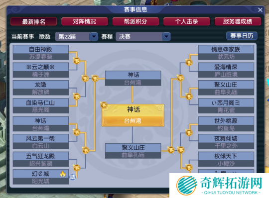 在第22届帮派决赛的中,击败【幻¢城】的【神话】凭借出色的战术实力、执行力和队伍实力接连在周五、周六的比赛中战胜【聚义山庄】,提前锁定本届联