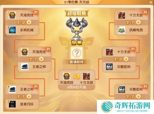 昨日,超级联赛四强比赛已全部结束后,天湾竞技以2:1的成绩逆转战胜王者之师,十方无敌以2:0的成绩带走非酷即帅,双方将于6月30日在线下角逐