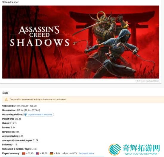 据第三方数据网站Gamalytic统计,《刺客信条:影》已在Steam平台卖出31 5万份。不过需要提醒的是,该网站的数据可能不够准确,具体数据以育碧官方为准。今日,育碧宣布《刺客信条:影》的玩家数已