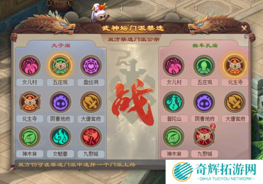夫子庙vs珍宝阁 观战方【珍宝阁】:女儿村、五庄观、化生寺、阴曹地府、九黎城,双封双辅助阵容。 对战方【夫子庙】:女儿村、五庄观、化生寺