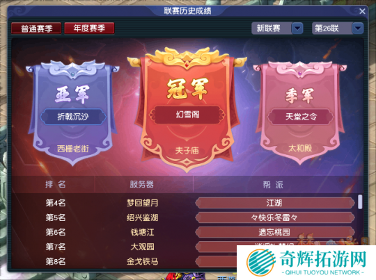 第 26 届帮派联赛目前已经全部结束,来自夫子庙服务器的【幻雪阁】凭借出色战术布置和默契的配合,击败西栅老街服务器的【折戟沉沙】,登上冠军舞