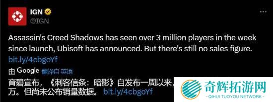 昨天晚上,育碧宣布《刺客信条:影》玩家数突破300万人。IGN也发推文报道了此事,但却在结尾处特别强调“仍未公布销量”,引发玩家热议。有玩家指出,育碧一般只会在财报中提到销量,而不是通过社媒公布。据悉