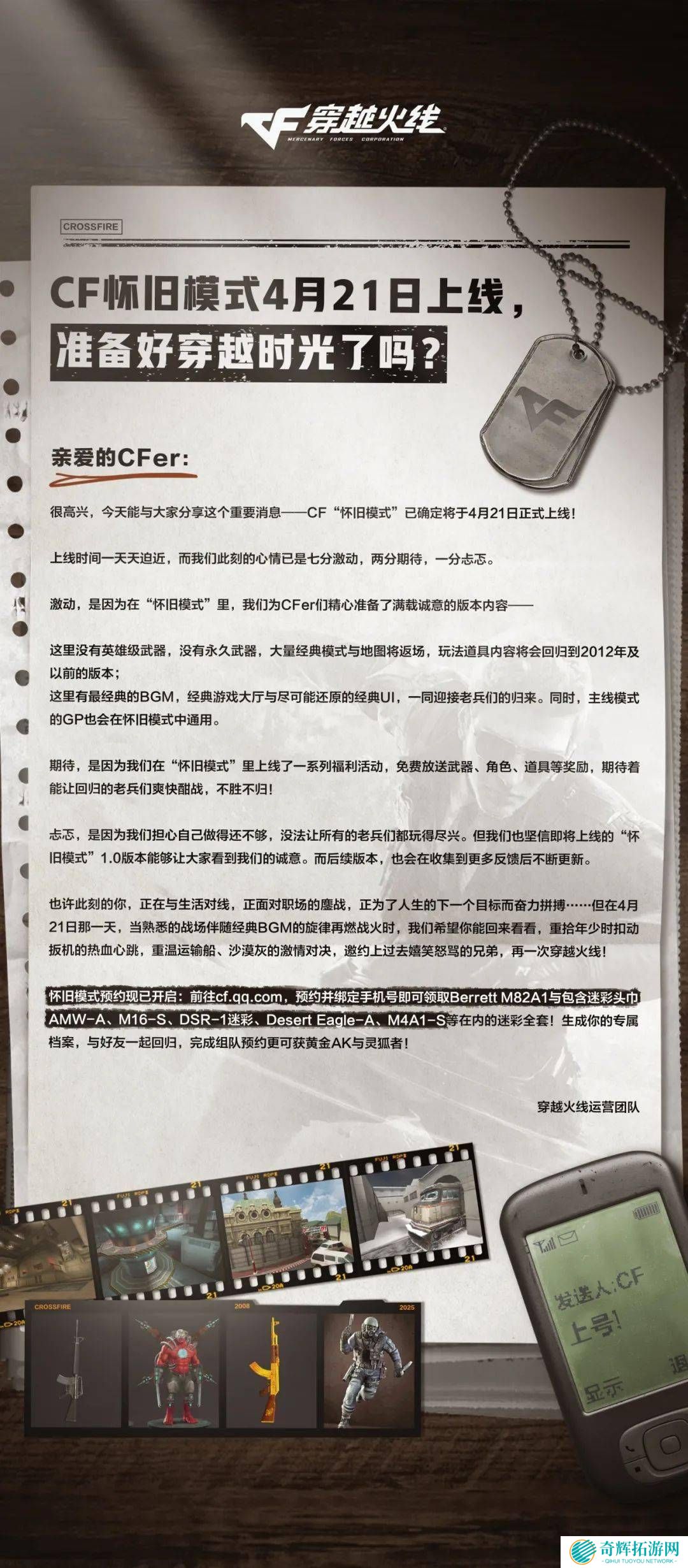 腾讯旗下热门第一人称射击游戏《穿越火线》近日宣布了一项令老玩家激动不已的消息:国服将推出怀旧模式,该模式定于4月21日正式上线。这一消息瞬间点燃了玩家们的热情,大家纷纷期待能够重温昔日的游戏时光。据悉