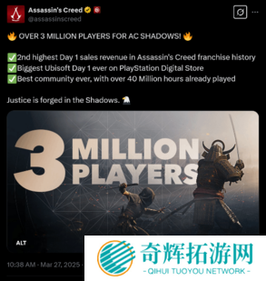 Ubisoft今日高调宣布,《刺客信条:影》自发售以来取得了巨大的成功,仅仅一周的时间,玩家数量已经突破三百万大关。就在四天前,Ubisoft才刚刚宣布《刺客信条:影》的玩家人数突破两百万。如此快速的