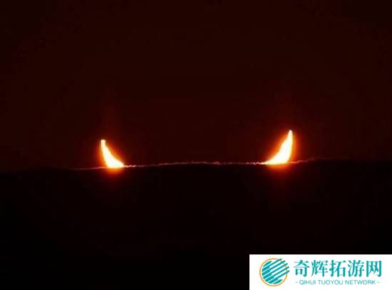 据新浪航天报道,近日发生日食,在加拿大东部和美国东北部还出现了“恶魔之角”Devil Sunrise奇特复杂的蜃景。从网友拍摄的照片看,被月亮遮挡的太阳仅剩下一小部分散发着光芒,而由于云层的遮盖,显现